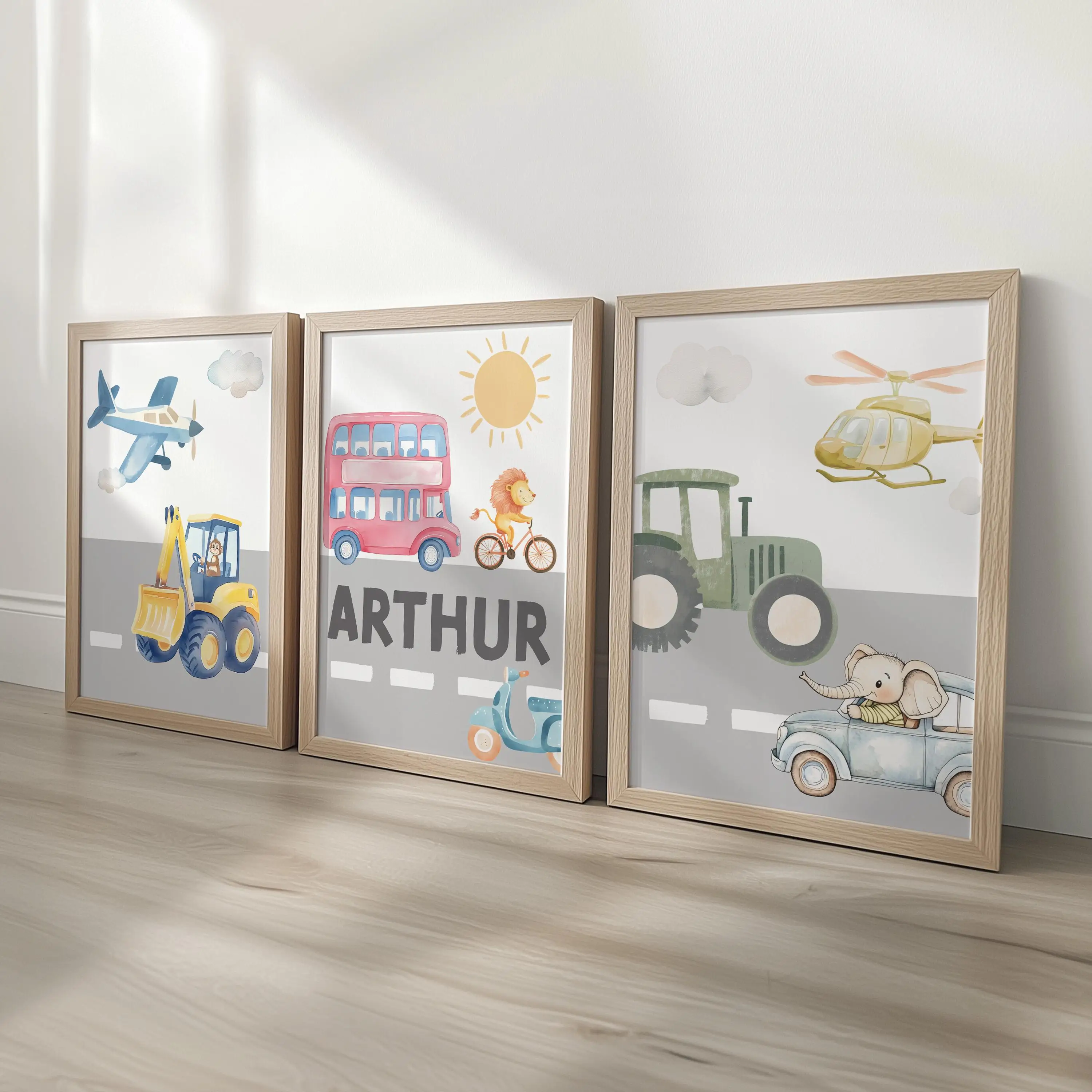 Ensemble de 3 imprimés muraux personnalisés pour chambre d'enfant, Transport d'animaux...