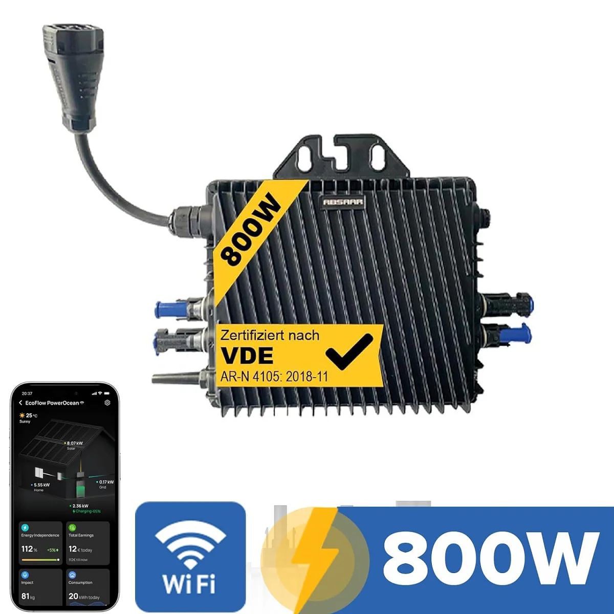 Micro onduleur 1200 W, onduleur solaire avec WLAN, étanche IP67, avec câble AC de 5 m p...