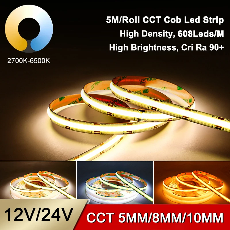 Haute luminosité 5 M/rouleau CCT 2700 K à 6500 K Cob bande LED variable 12 V 24 V Ra90...