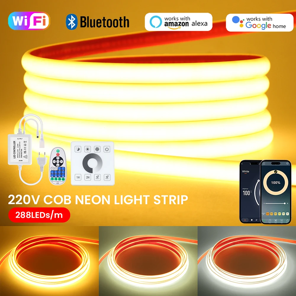 Bande lumineuse LED néon COB, Bluetooth, WIFI, 220V, avec ruban adhésif, tél&ea...