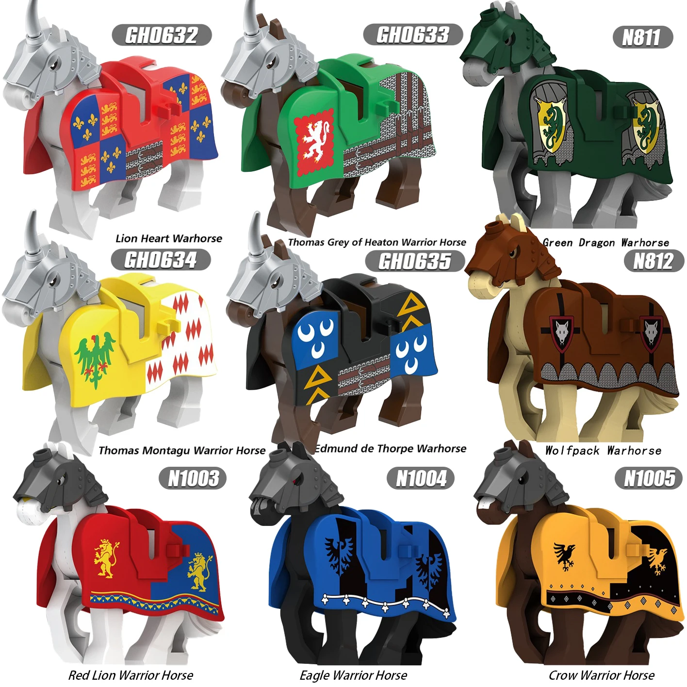 MOC Medeival Knights Horse importer décennie ks, Crow, Wolf, Warhorse, Eagle Discuting, Green...