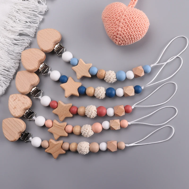 Chaîne de sucette en bois au Crochet pour bébé, perle ronde, cœur en bois,...