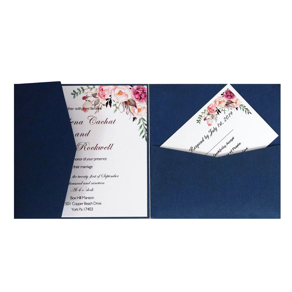 50 Vintage trois plis poche mariage invitation carte personnalisé imprimé bleu marine ...
