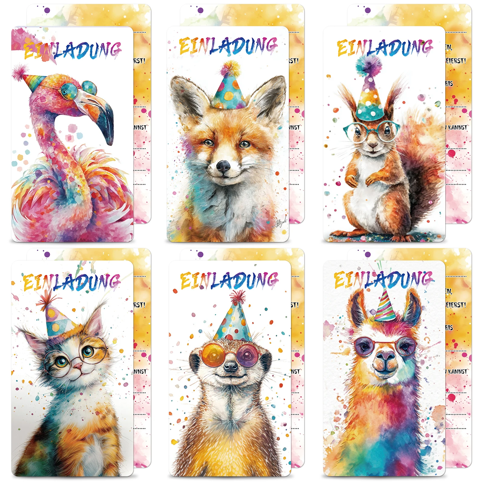 12 cartes d'invitation de fête d'animaux aquarelle en allemand, ensemble de cartes d'invitatio...