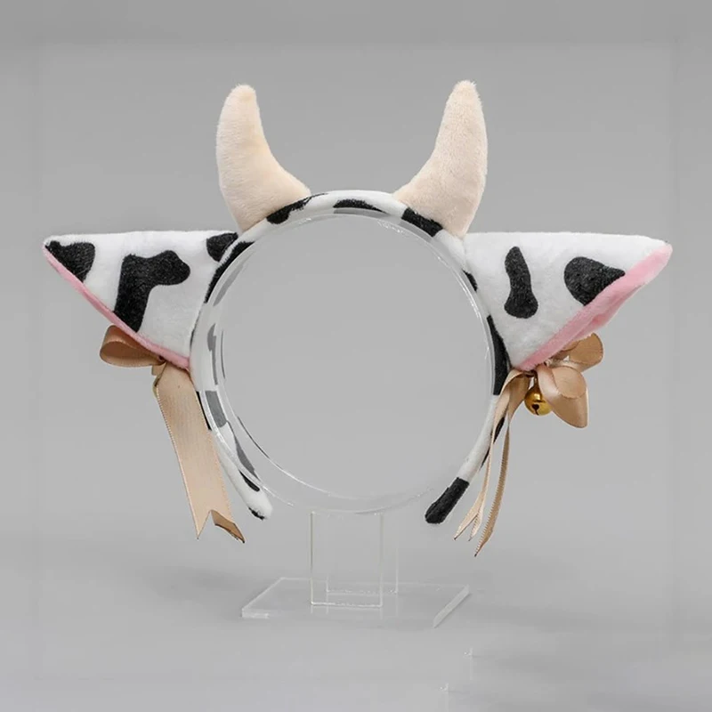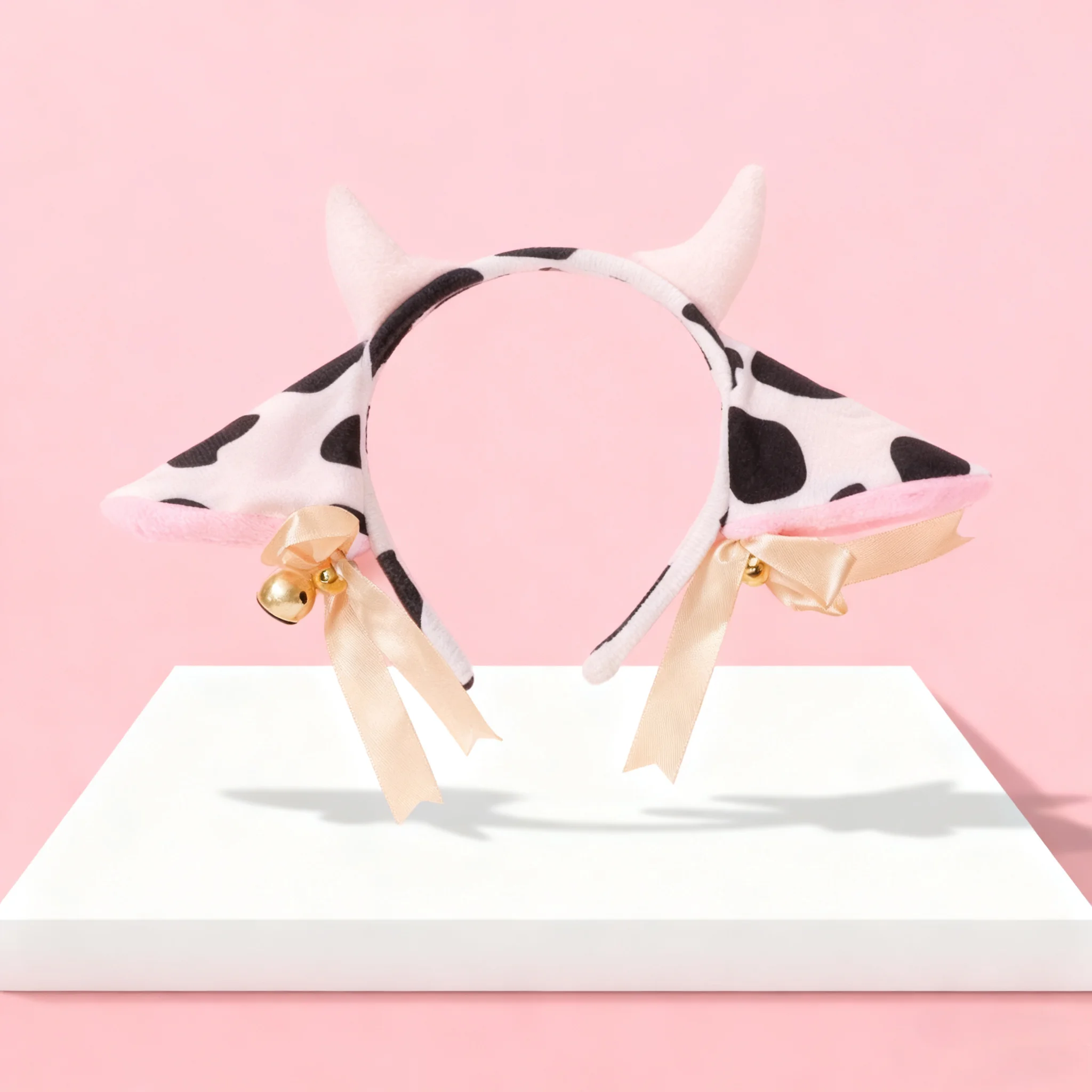 Bandeau en corne avec oreilles de vache en peluche, avec petites cloches, nœud en ruban, cerce...