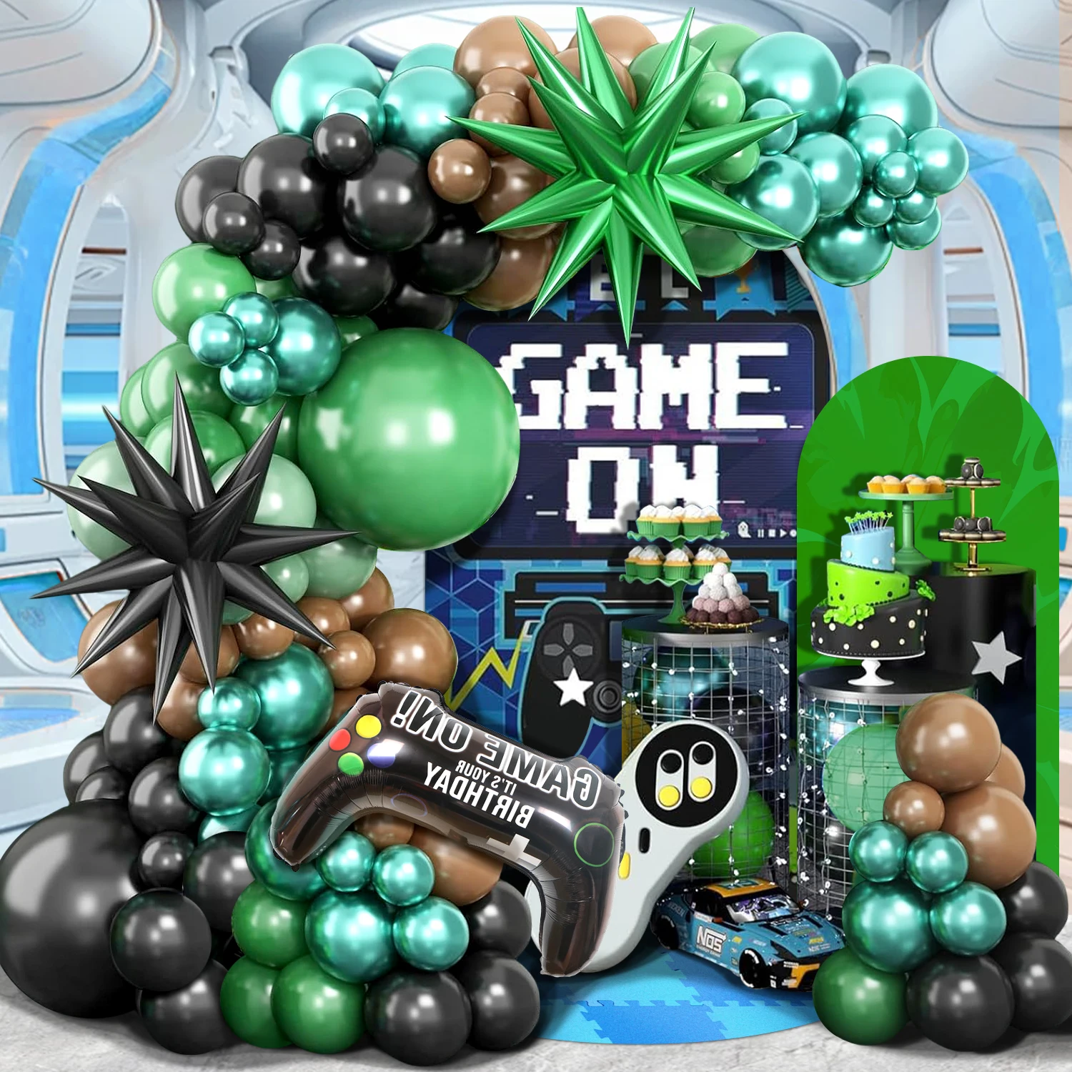 107pcs green and black game-themed balloon garland set, paired with green and black explosion stars ...