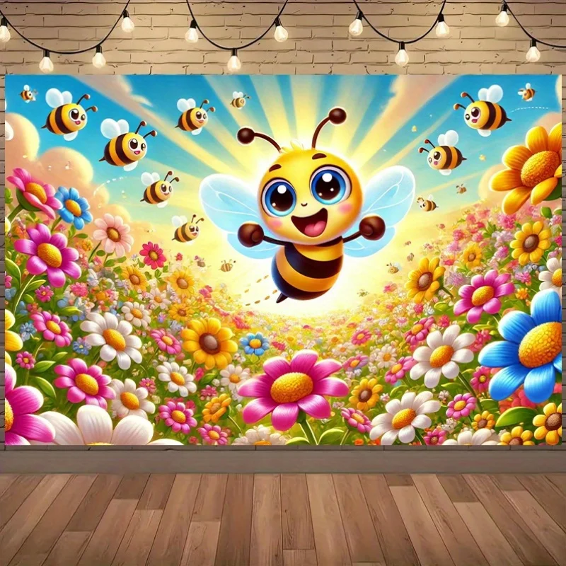 Abeilles de dessin animé joyeuses volant dans des champs de fleurs colorés, déc...