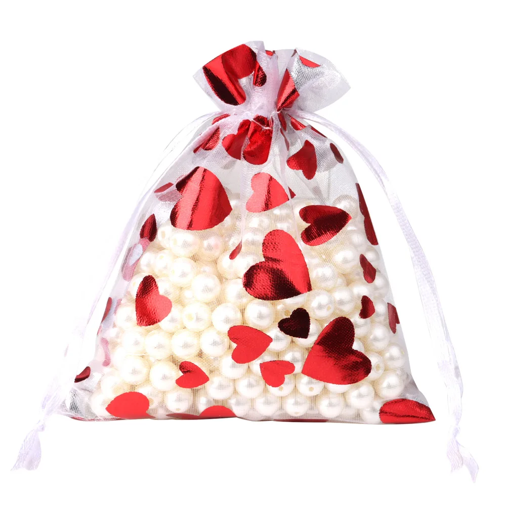 25/50pcs 8x10 9x12 10x15 13x18cm blanc rose Organza sac coeur rouge sacs d'emballage saint valentin ...
