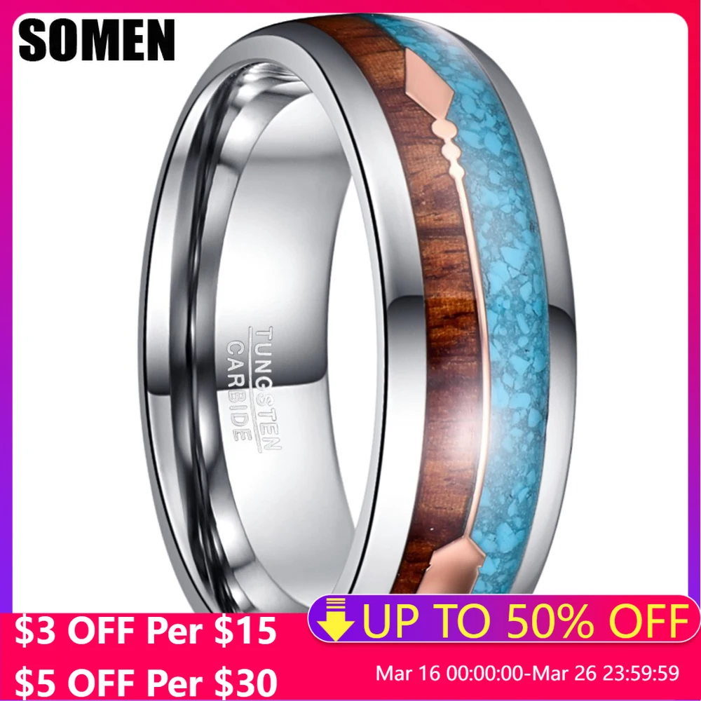 Somen 8mm dôme bague en carbure de tungstène pour hommes bois Turquoise incrustation co...
