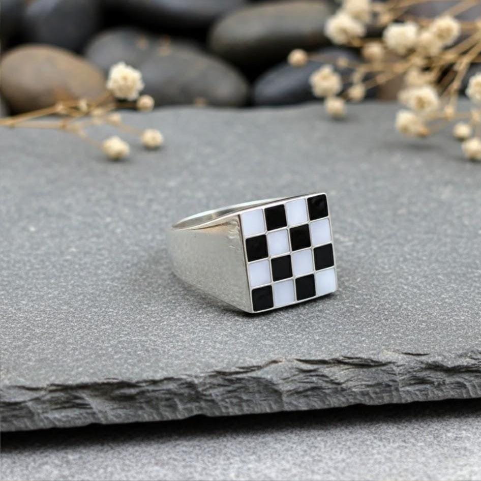 Bague échiquier faite main en argent sterling plaqué ...