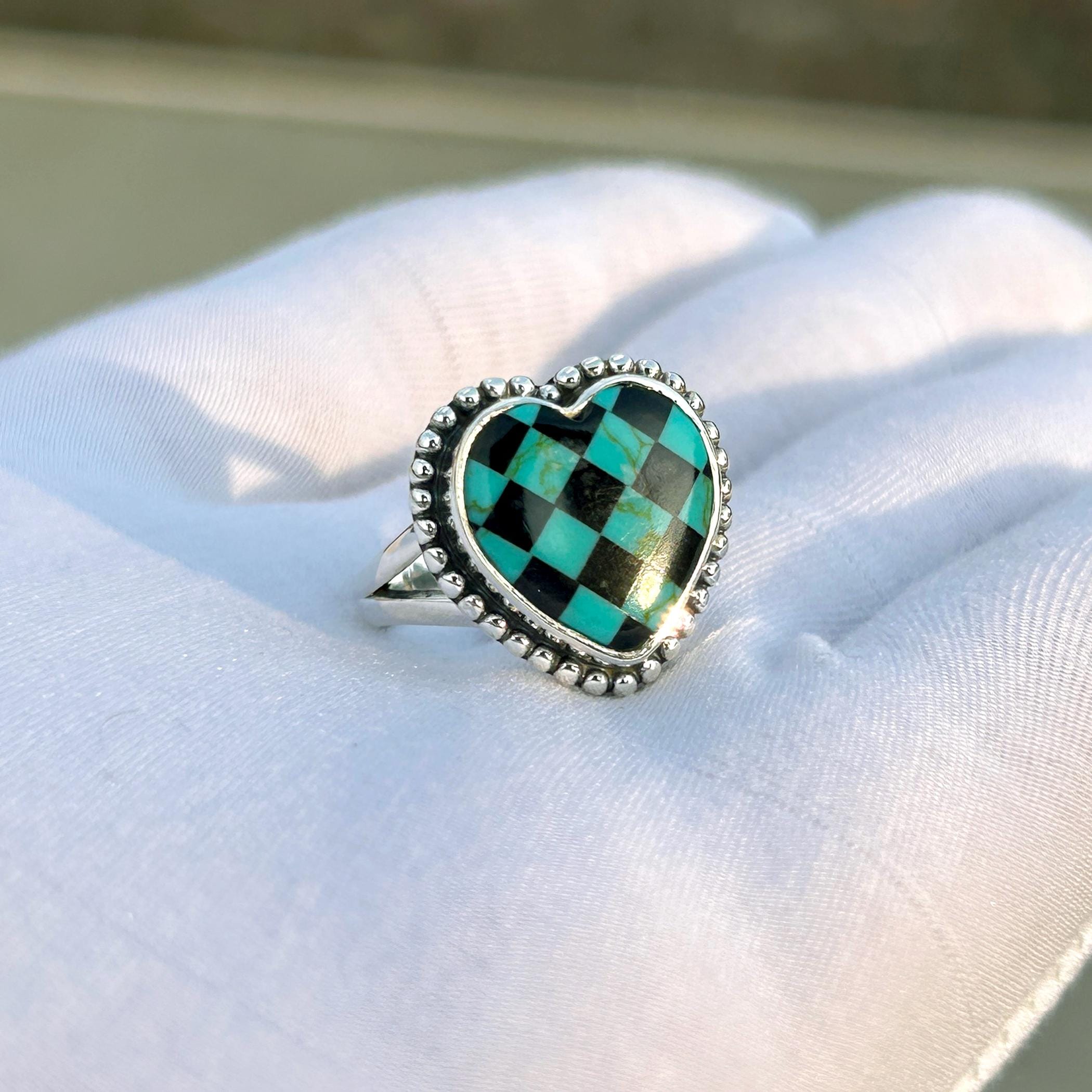 Bague coeur turquoise : échiquier en argent sterling 925