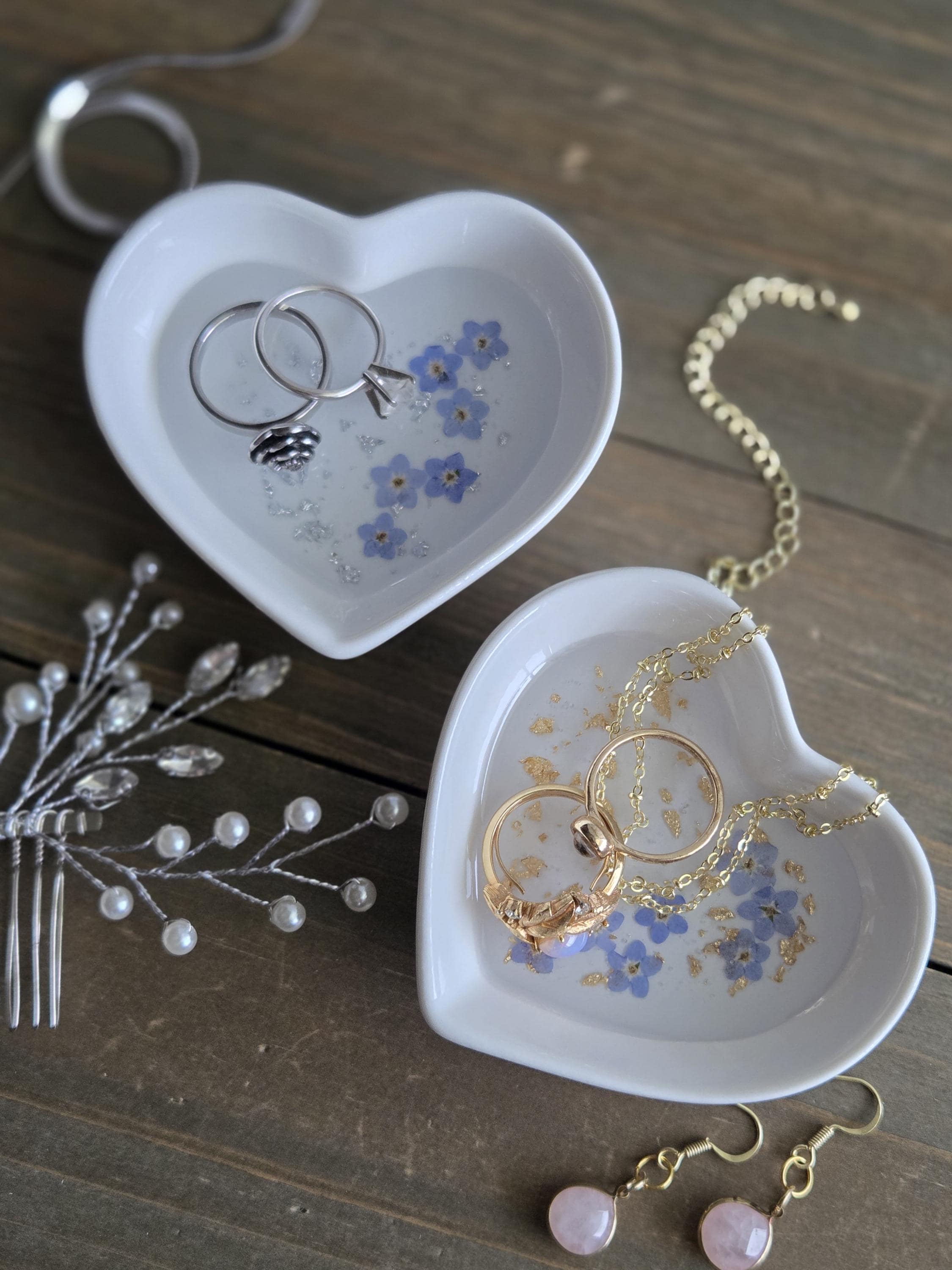 Belle coupelle à bijoux en forme de coeur en céramique lisse avec de vrais péta...