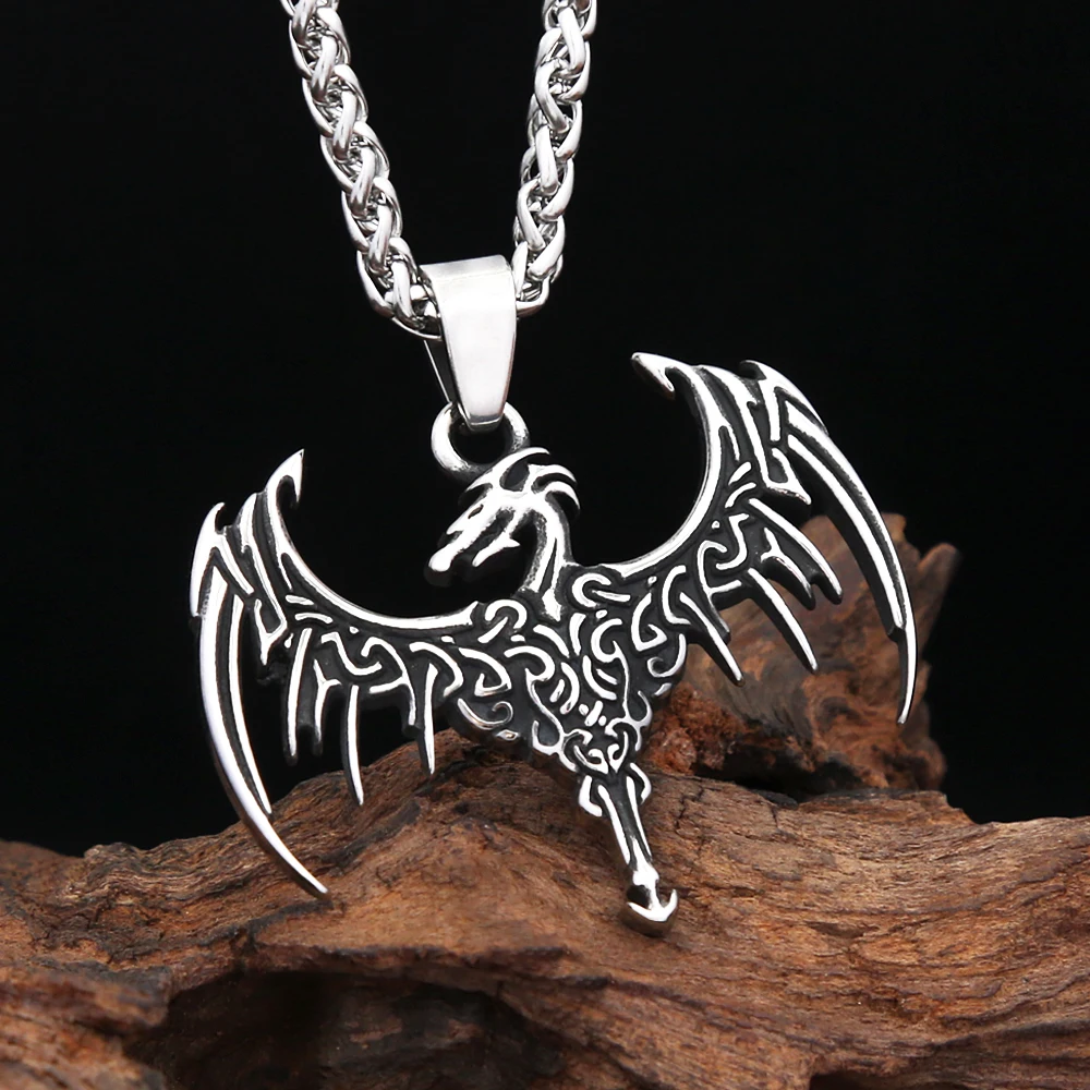 Collier pendentif dragon volant viking vintage pour homme, acier inoxydable, amulette animale nordiq...