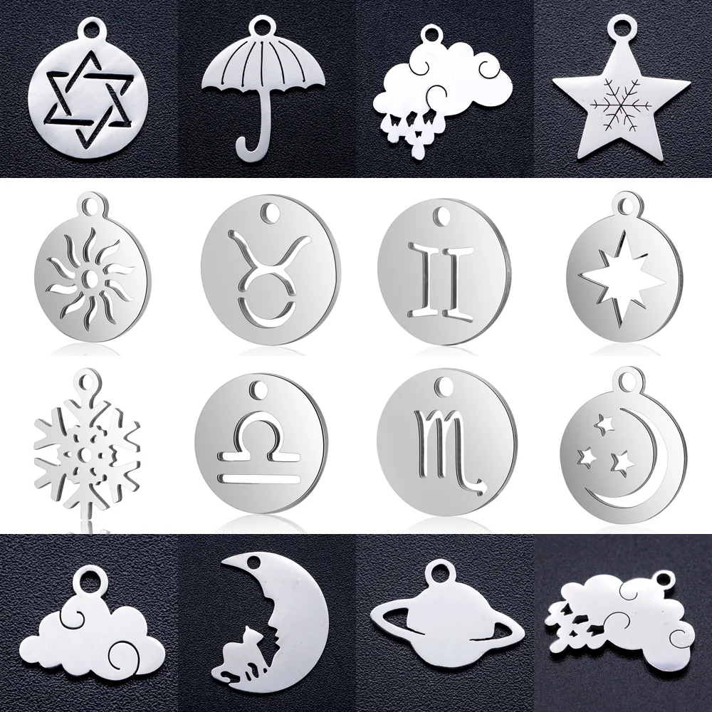 Breloques signe du zodiaque en acier inoxydable, pendentif soleil, étoile, nuage, lune, chat,...