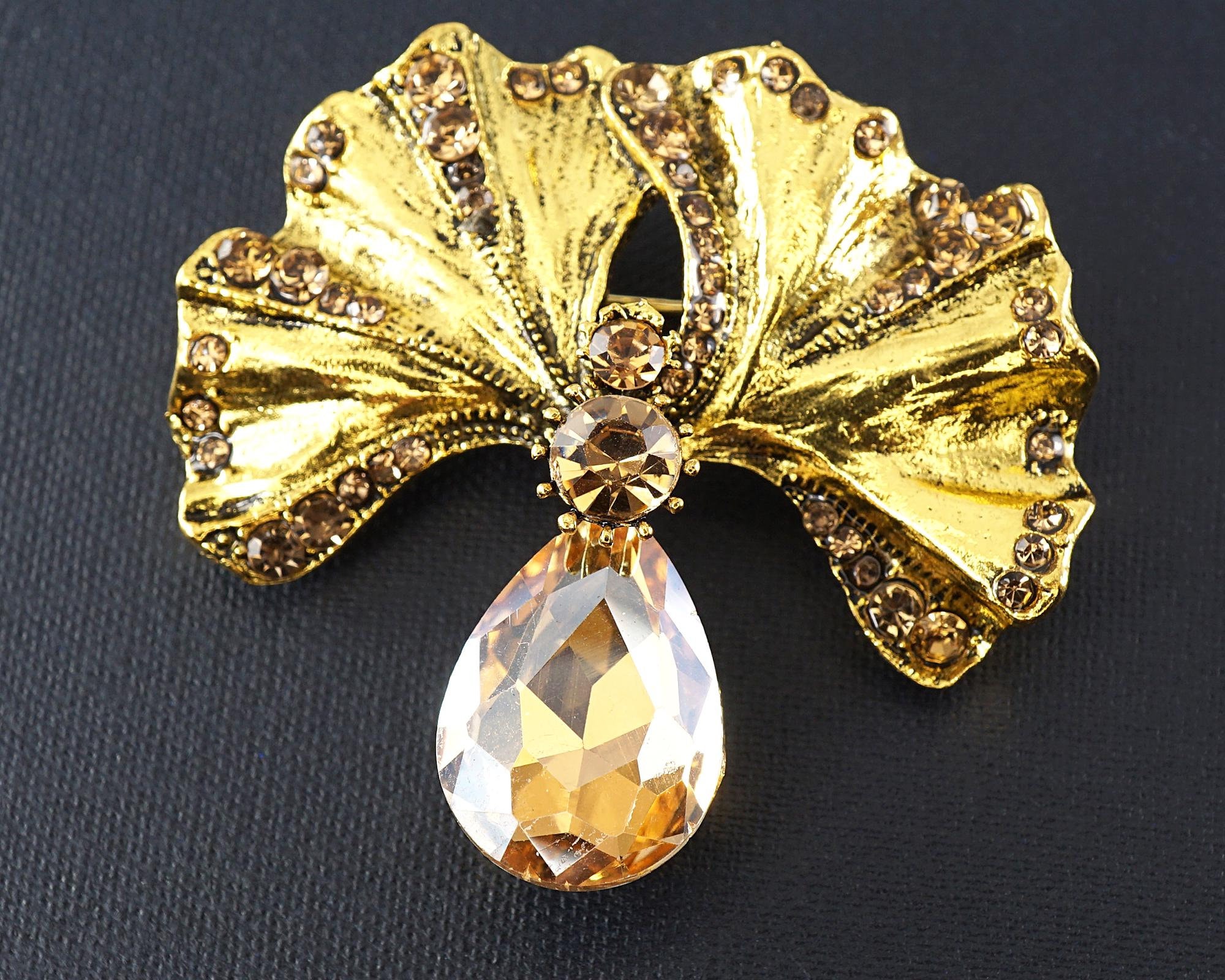 Épingle feuille de ginkgo en or, broche botanique, cristal c...