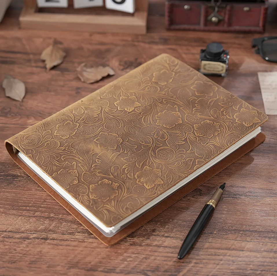 Carnet de notes A4 A5 en cuir de vache sculpté, livre élargi, classeur B5 en cuir de c...