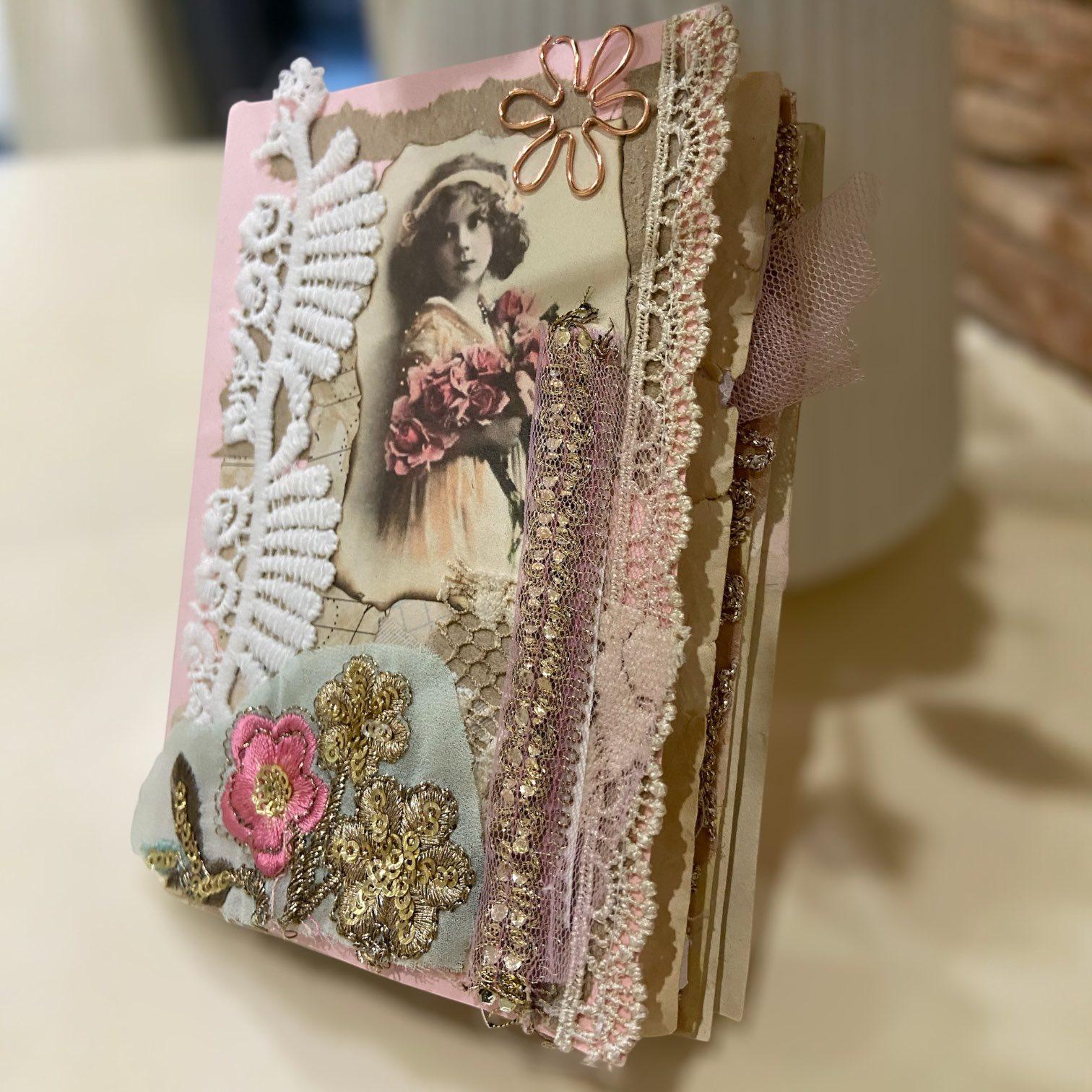 Carnet fait main Roses roses - Carnet de voyage shabby chic Pochette avec étiquette Cré...
