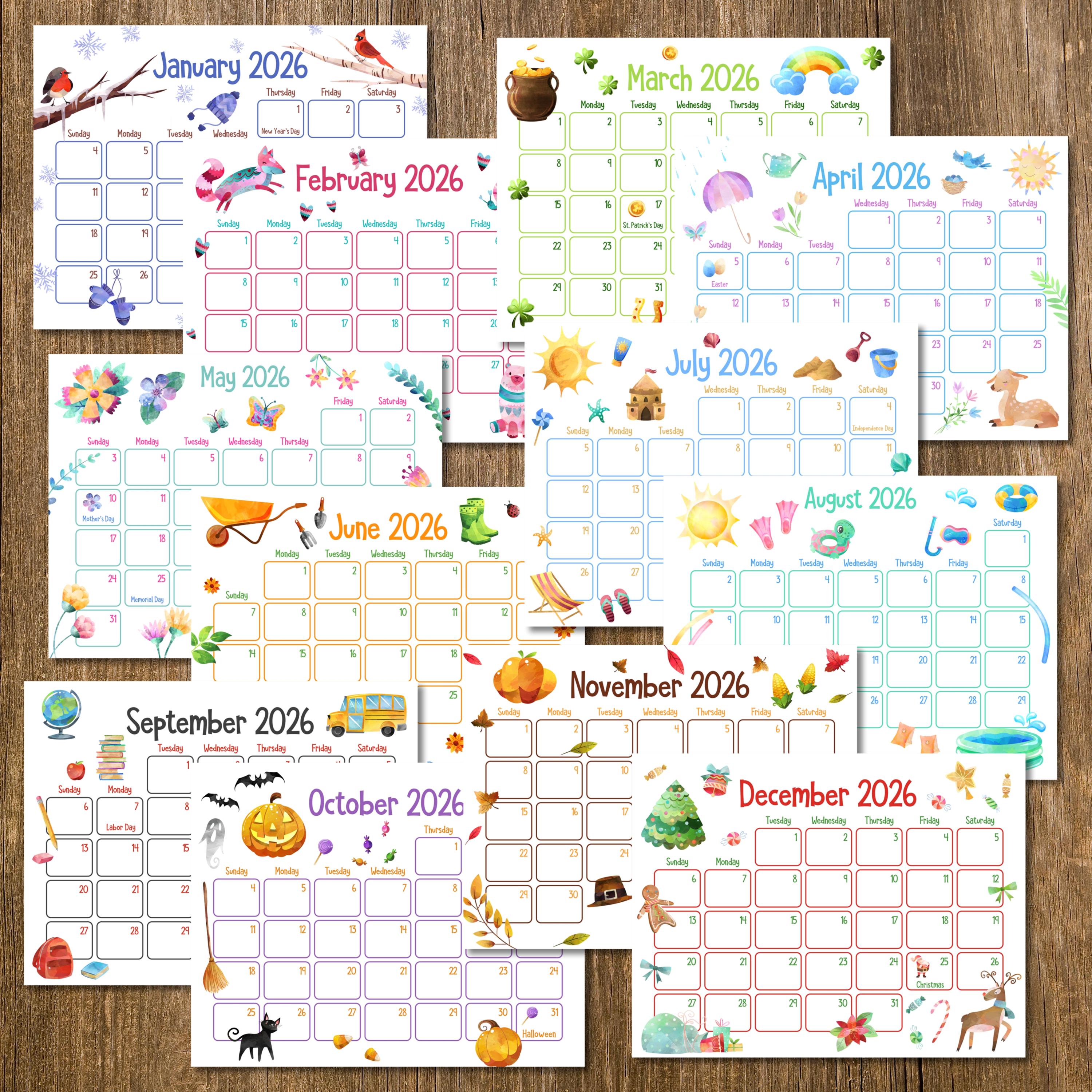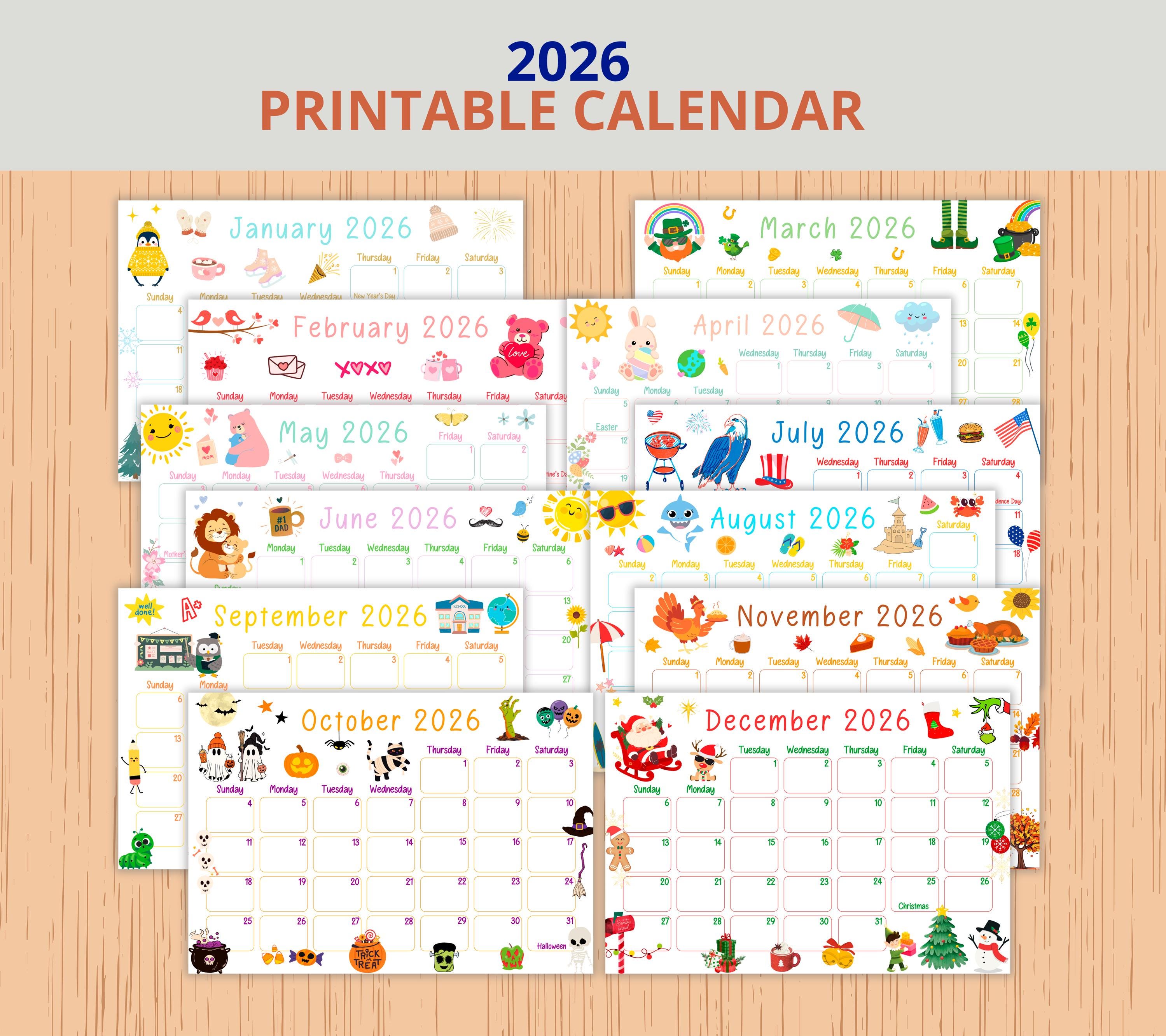 Calendrier 2026 à imprimer, calendrier pour enfants mignons 2026, calendrier mural PDF, calen...