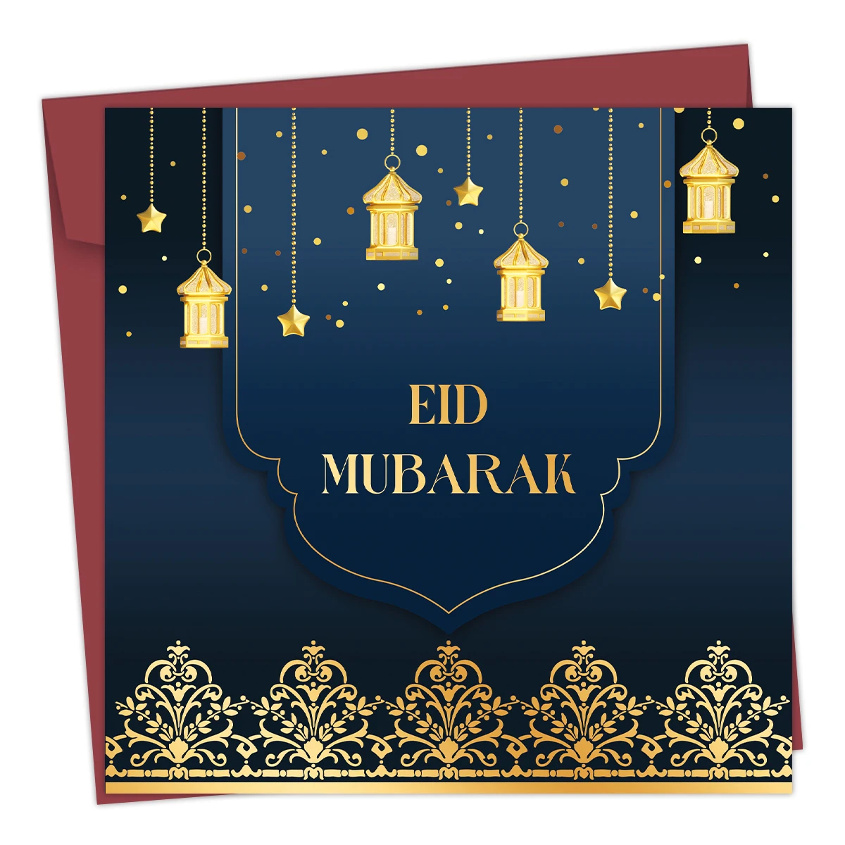 1 carte de vœux Eid Mubarak bleue et dorée avec enveloppe, design lanternes et é...