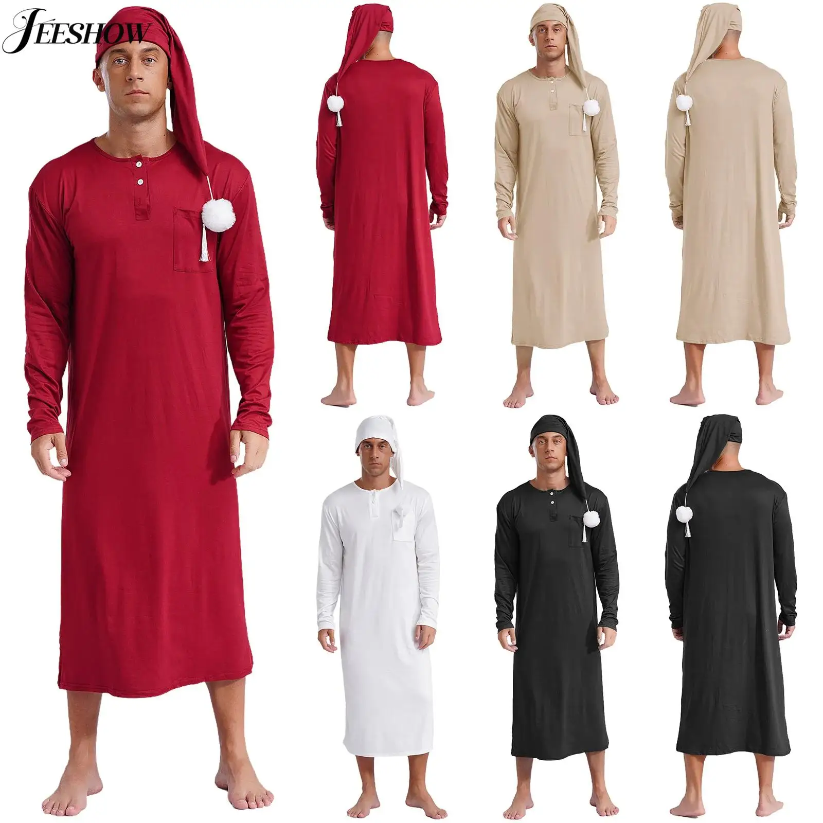 Robe de nuit à manches longues pour hommes, couleur unie, avec bonnet de nuit, col rond, gran...