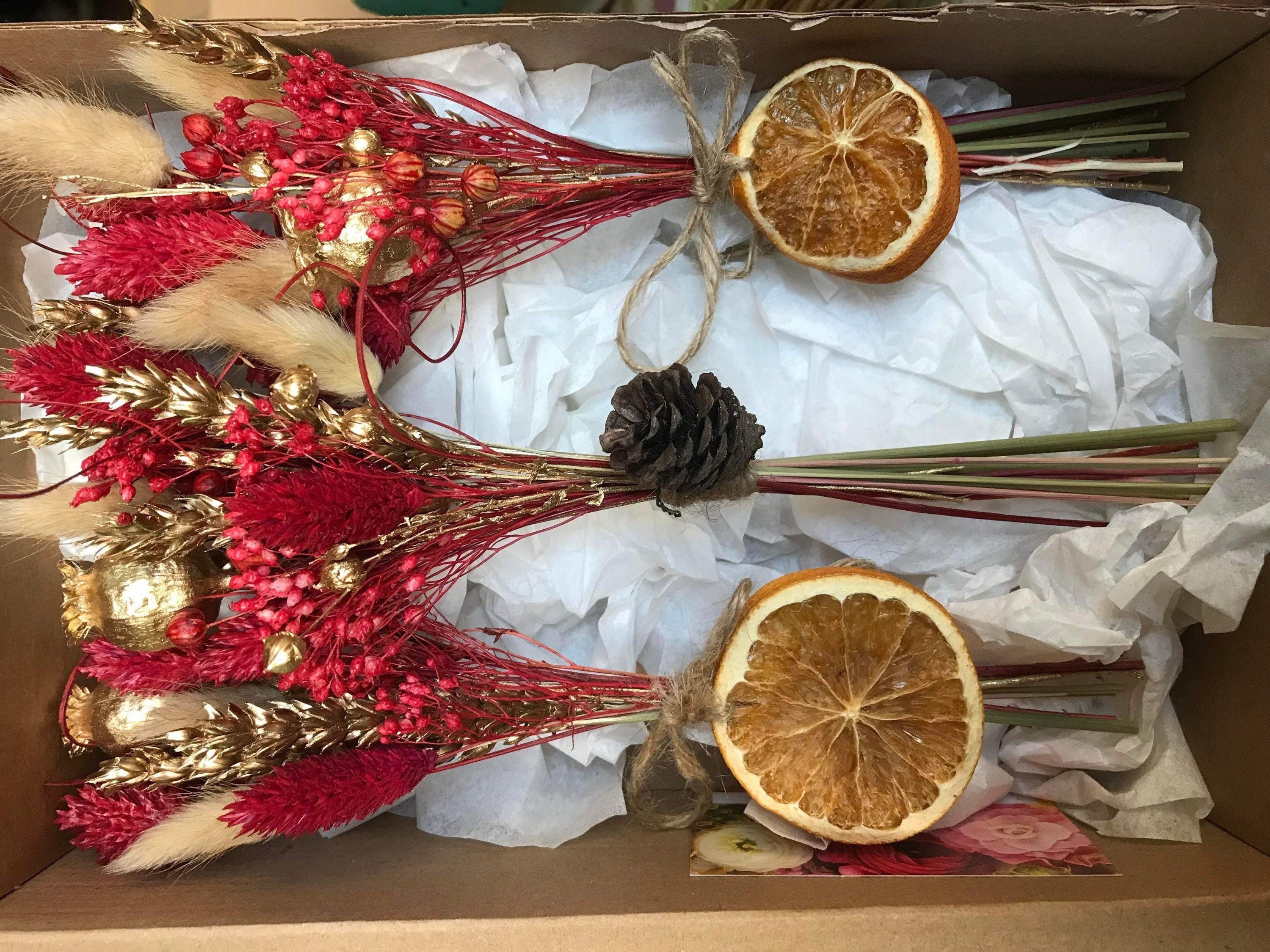 Un bel ensemble de trois arrangements festifs de bouquets de fleurs séchées, topper av...