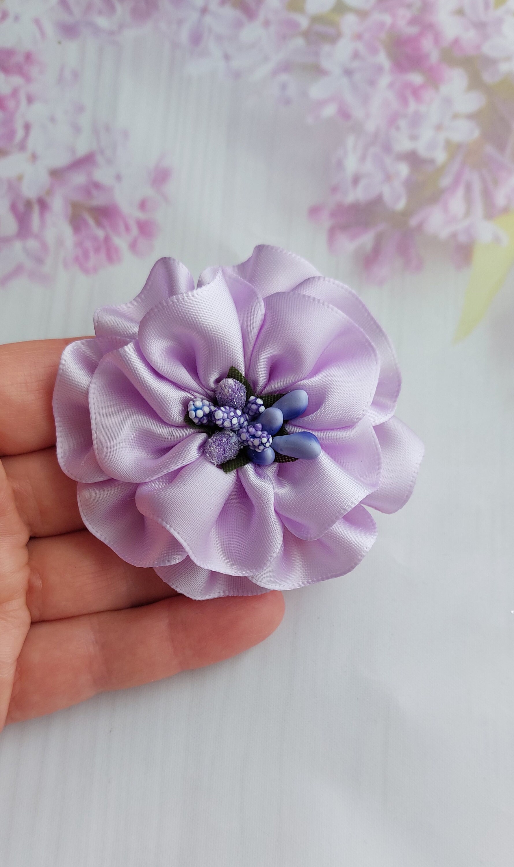 Fleur en ruban de satin fait main Couleur - lilas Mesure 6,5 - 7 cm environ. 1 broche, 1 barrette &a...