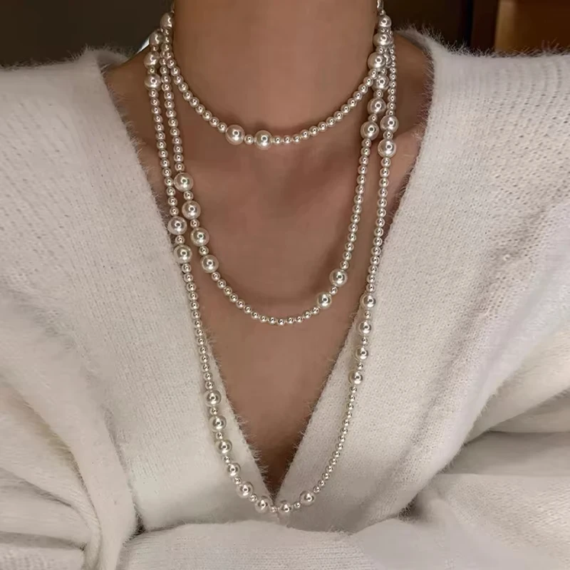 Collier long vintage à plusieurs rangs de perles pour femmes...