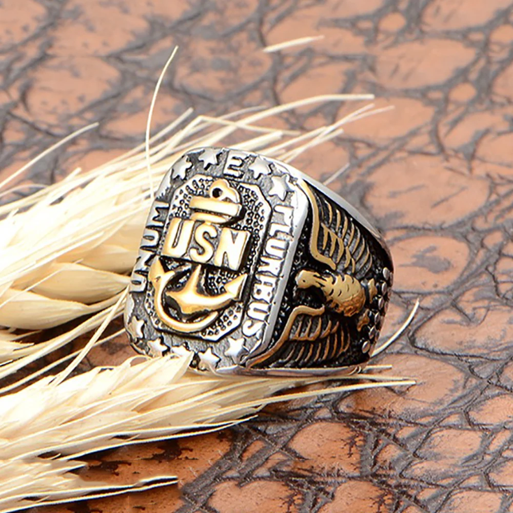 Bague vintage en acier inoxydable pour hommes, US Navy, USN Eagle Injector, Hip Hop Gold Document Si...