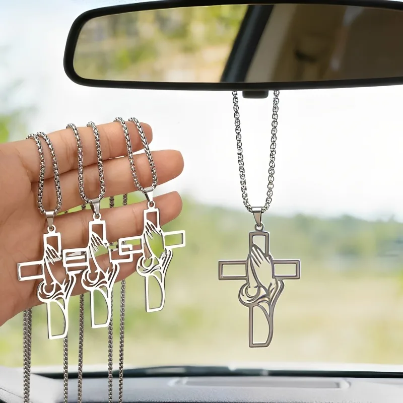 Pendentif en acier inoxydable pour voiture, mains en prière creuses, pendentif croix pour r&e...