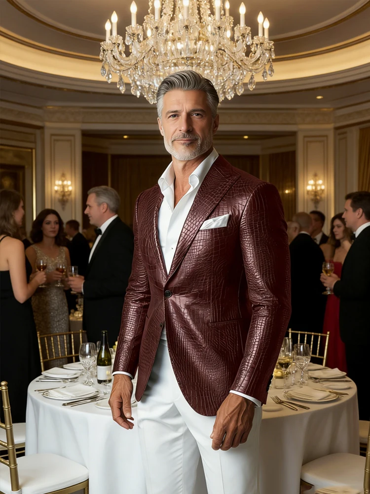Blazer élégant marron en similicuir crocodile pour homme, col châle, manches lon...