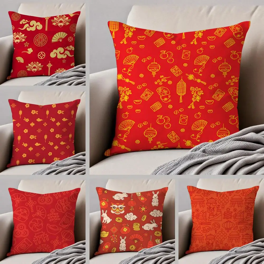 Housse de coussin à motifs festifs et porte-bonheur rouges chinois, housse de coussin d&eacut...