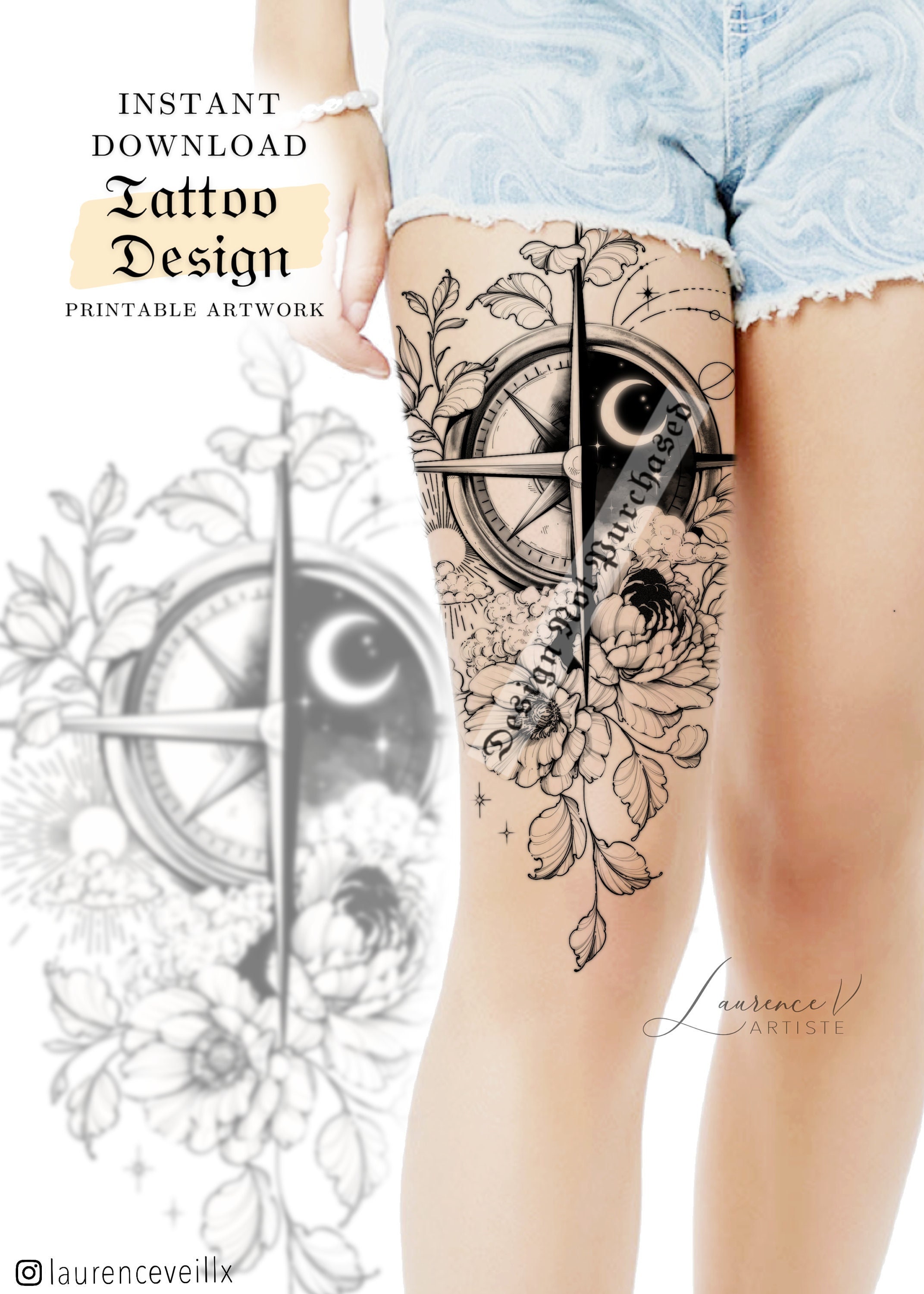 "Tattoo Design for Women Body Art Compass, Celestial Moon Sun, Peony Poppy Flowers Tattoo Ideas...
