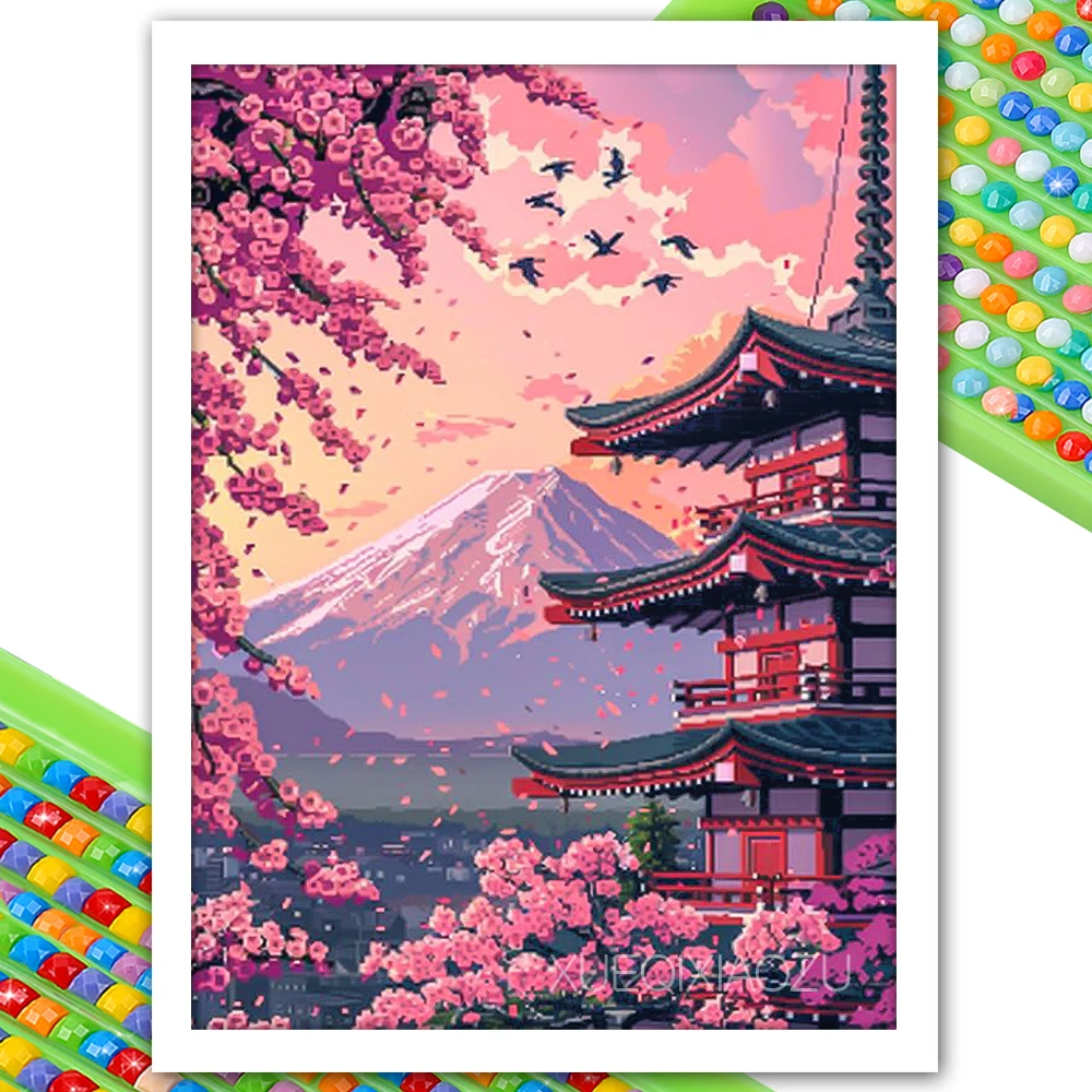 Peinture diamant de paysage numérique, tour de fleurs de cerisier, décoration murale d...