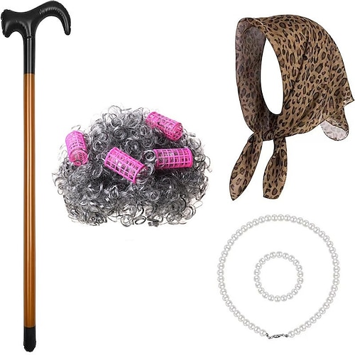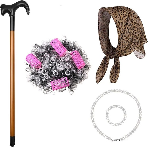 Costume de vieille dame avec perruque blanche bigoudis, foulard l&e...