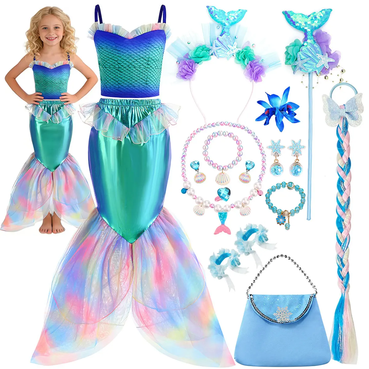 Robe sirène sans manches Disney pour filles, ensemble deux pièces, costume de cosplay ...