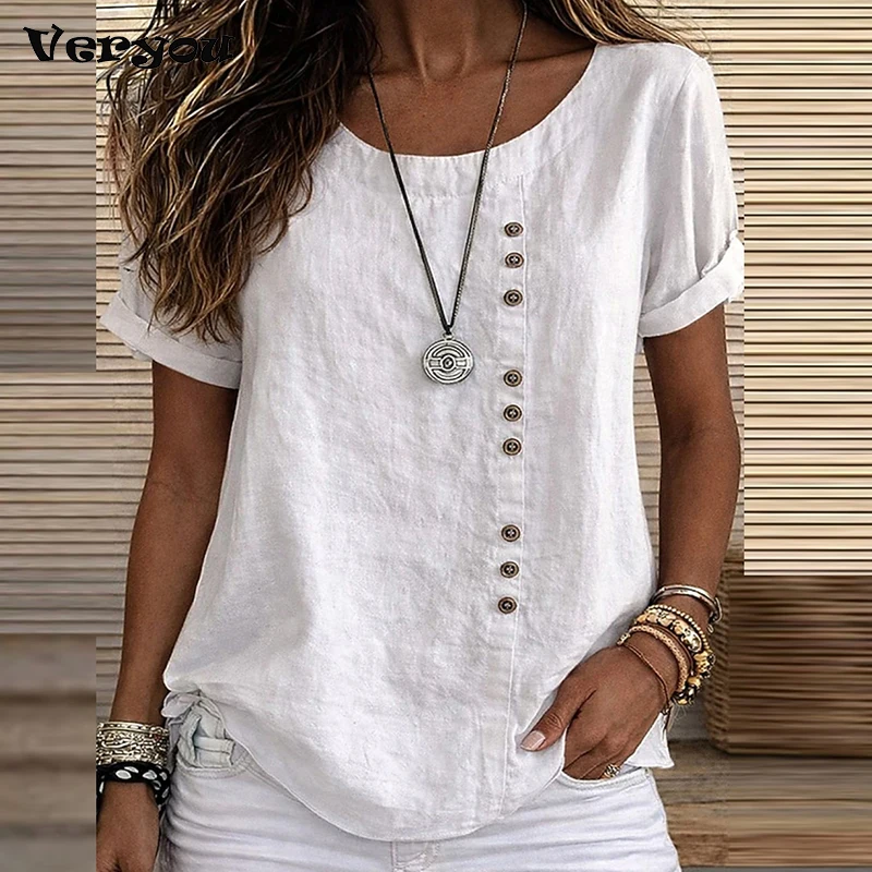 T-shirts vintage à manches courtes pour femmes, col rond, design boutonné, tee-shirt a...
