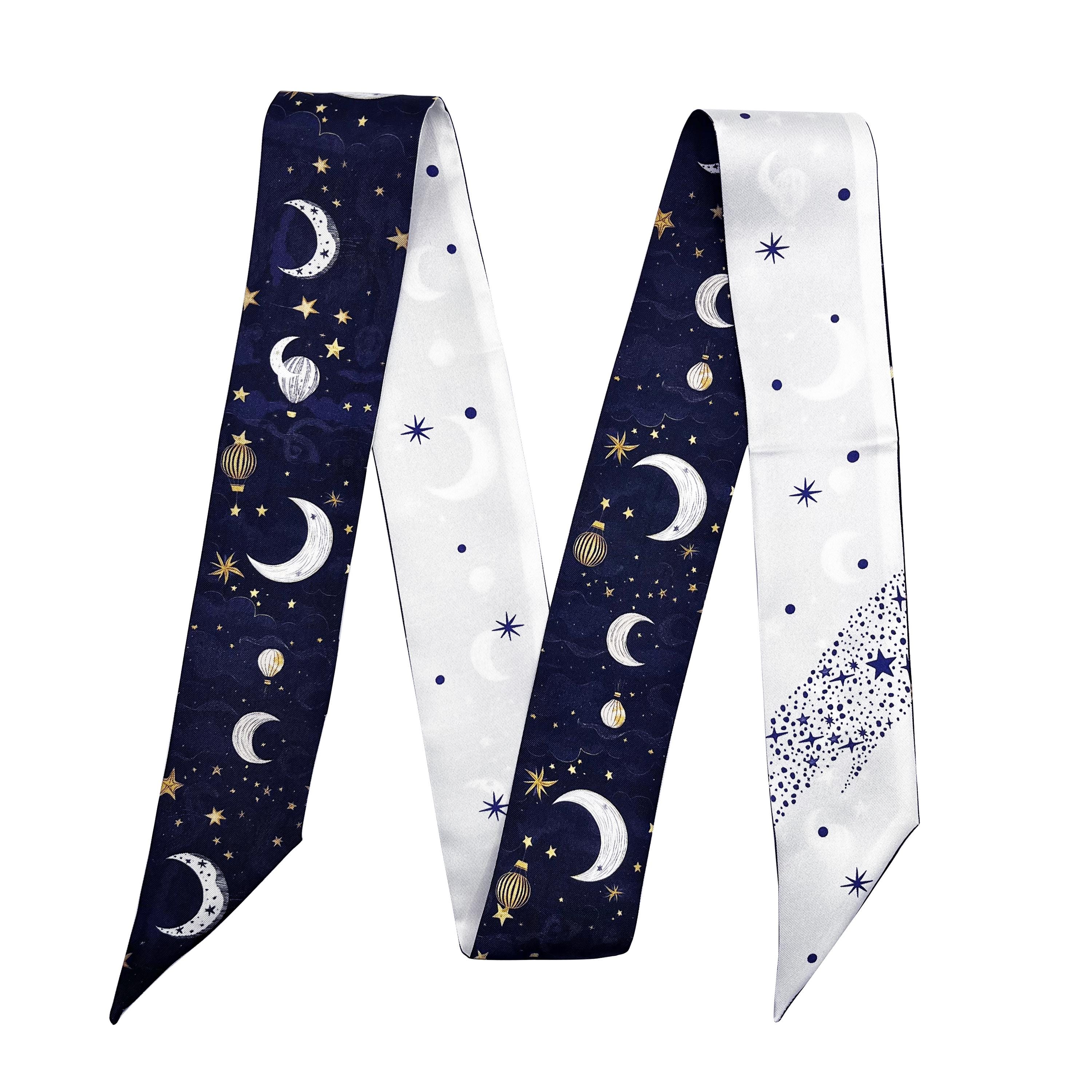 100% Mulberry Silk Skinny Scarf - Dark Blue & White Star and Mo...