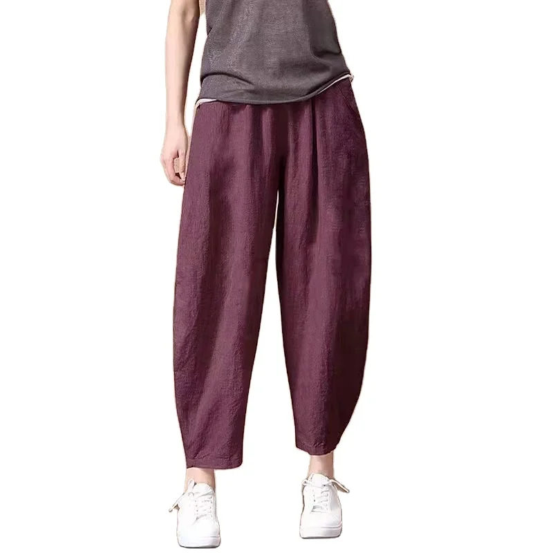 Pantalon en lin de coton pour femmes taille élastique pantal...