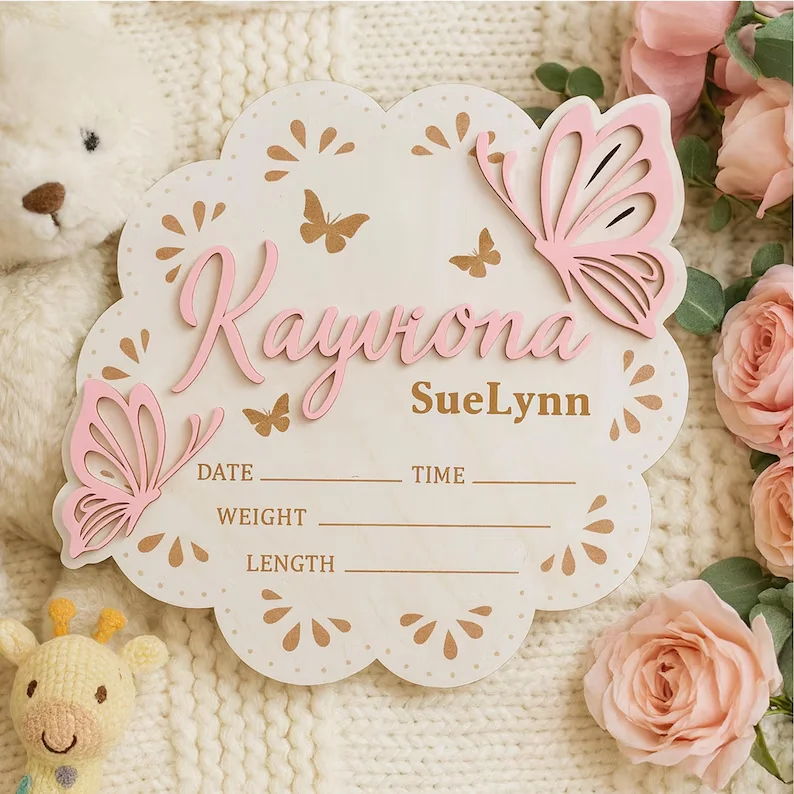 1 plaque d'annonce de naissance pour bébé avec papillon, plaque personnalisée e...