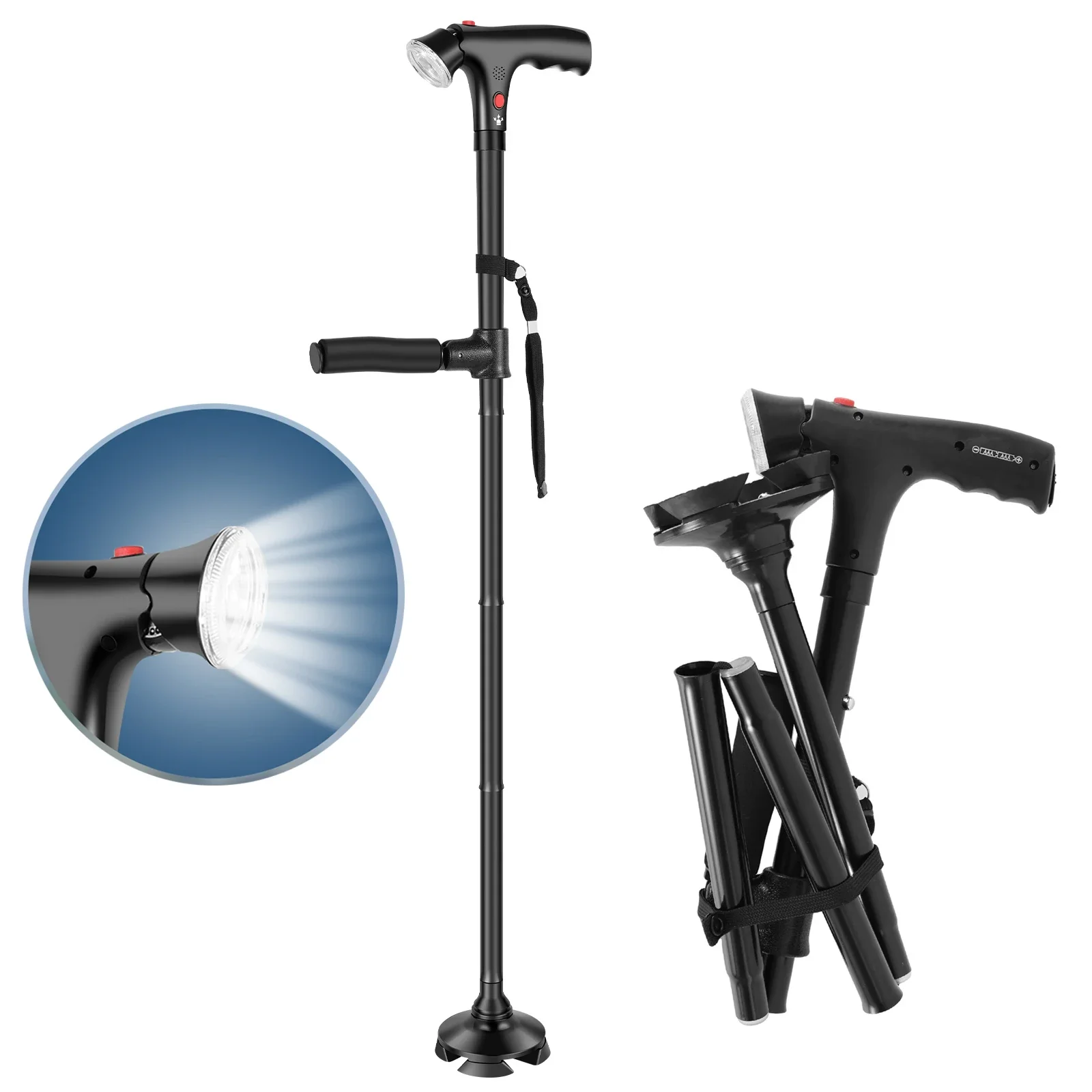 Canne pliante pour personnes âgées avec lumière LED, quatre pieds antidér...
