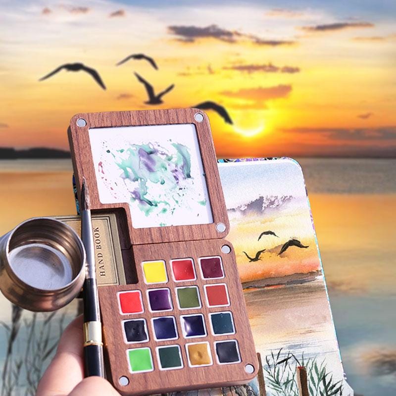Mini coffret aquarelle en noyer - 15 couleurs de peintures solides ...