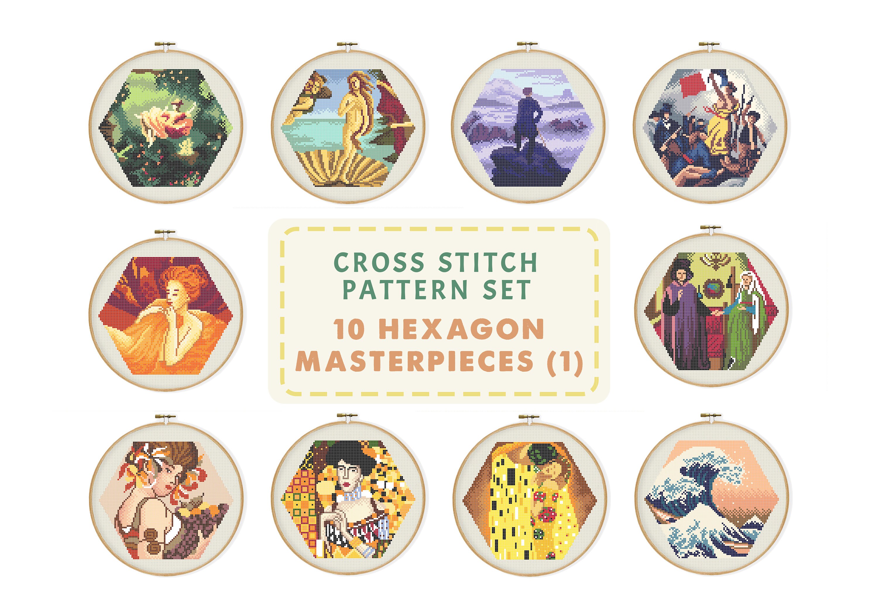 Set 40 Art Cross Stitch Pattern, Hexagon Great Famous Paintings Fin...