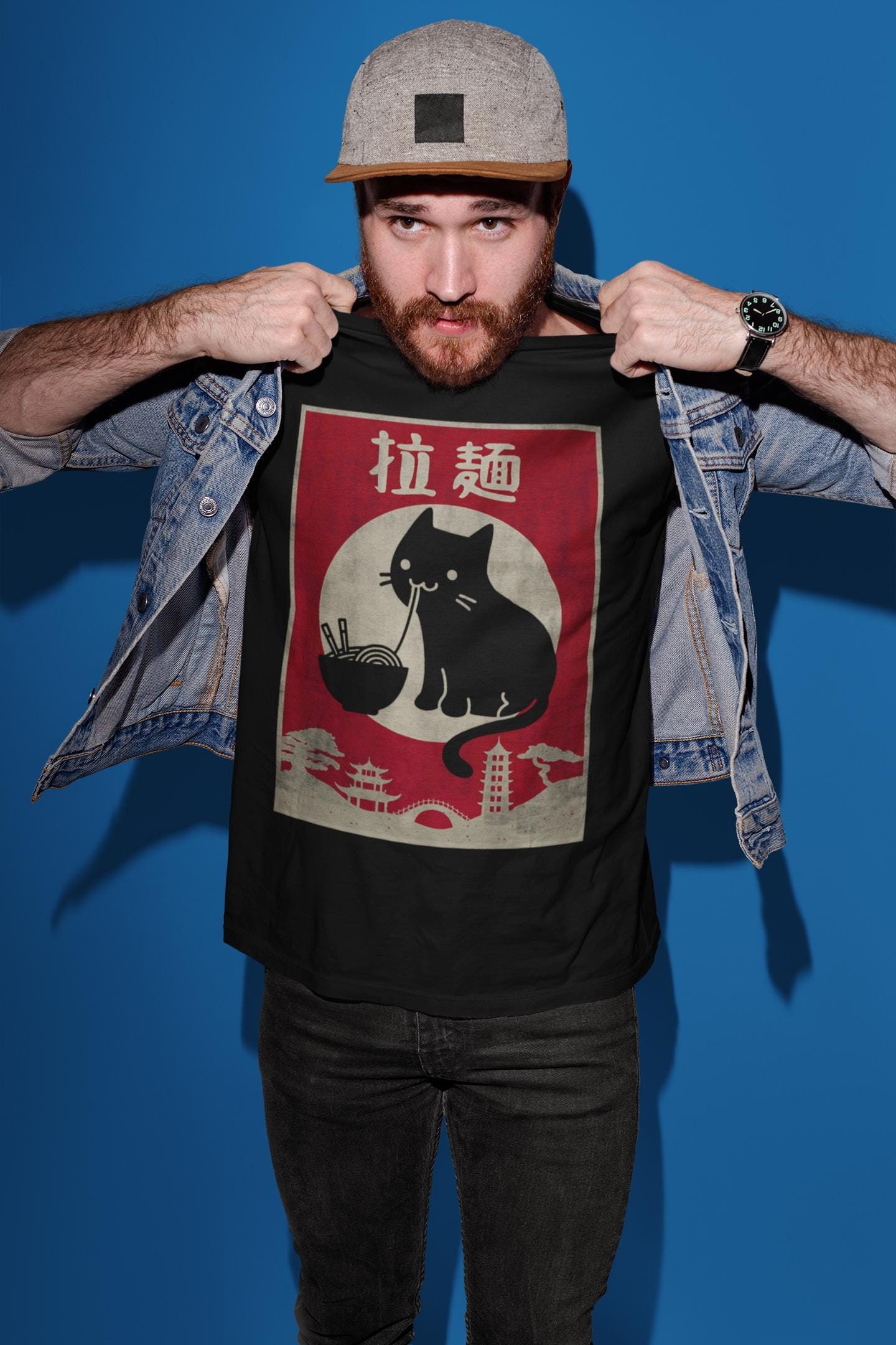 Chemise kawaii chat noir, cadeau pour amoureux des chats, amateur de ramen, cadeau japonais anime ja...