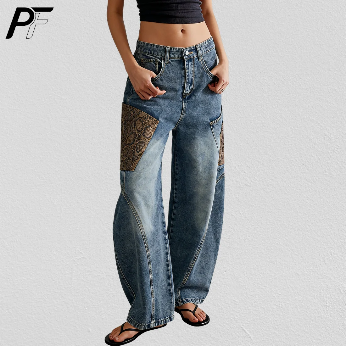 Jean baggy Y2K à jambe large avec poche effet peau de serpent, jean denim taille haute, d&eac...
