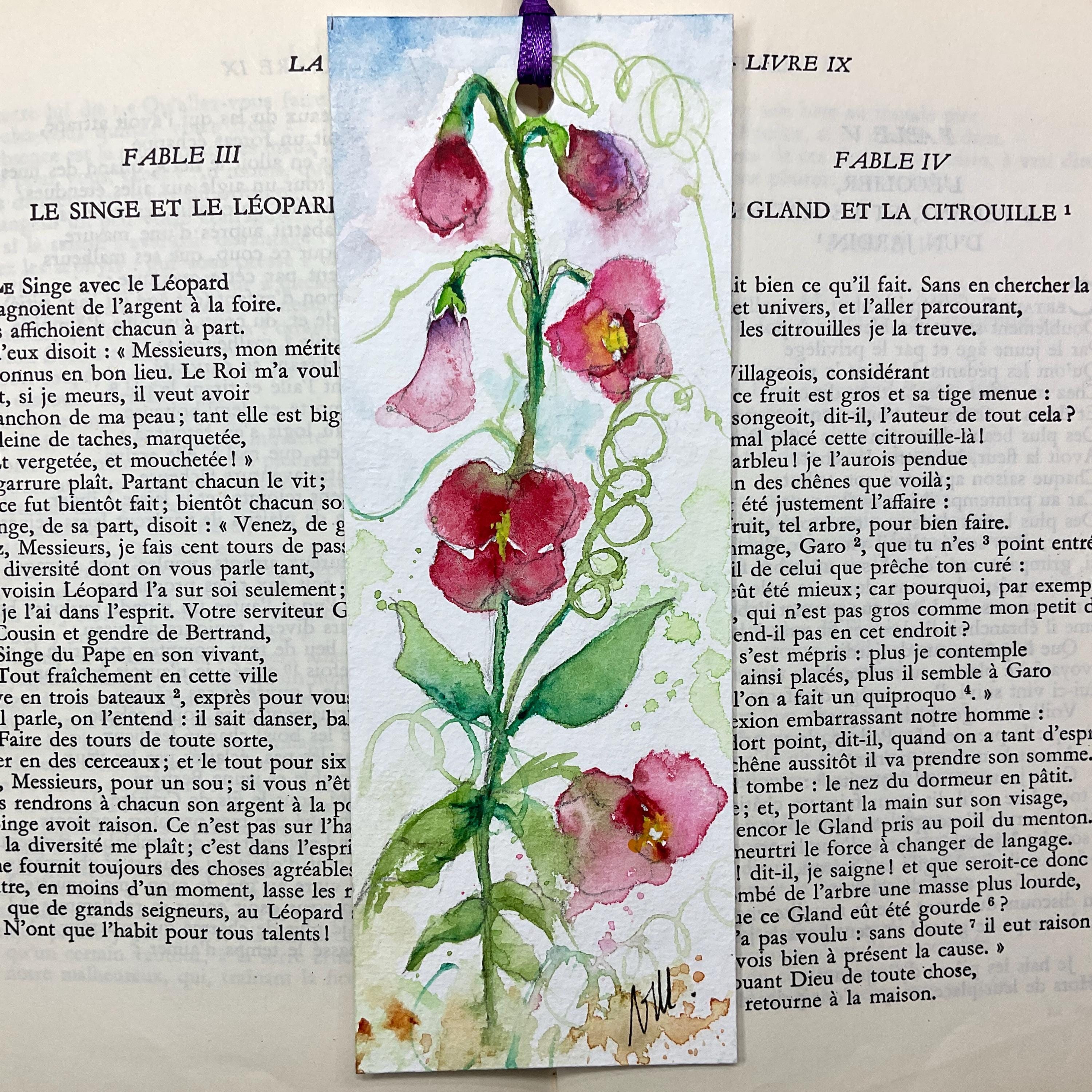 Un marque page unique et délicat : des pois de senteur roses et mauves, peints à l'aqu...