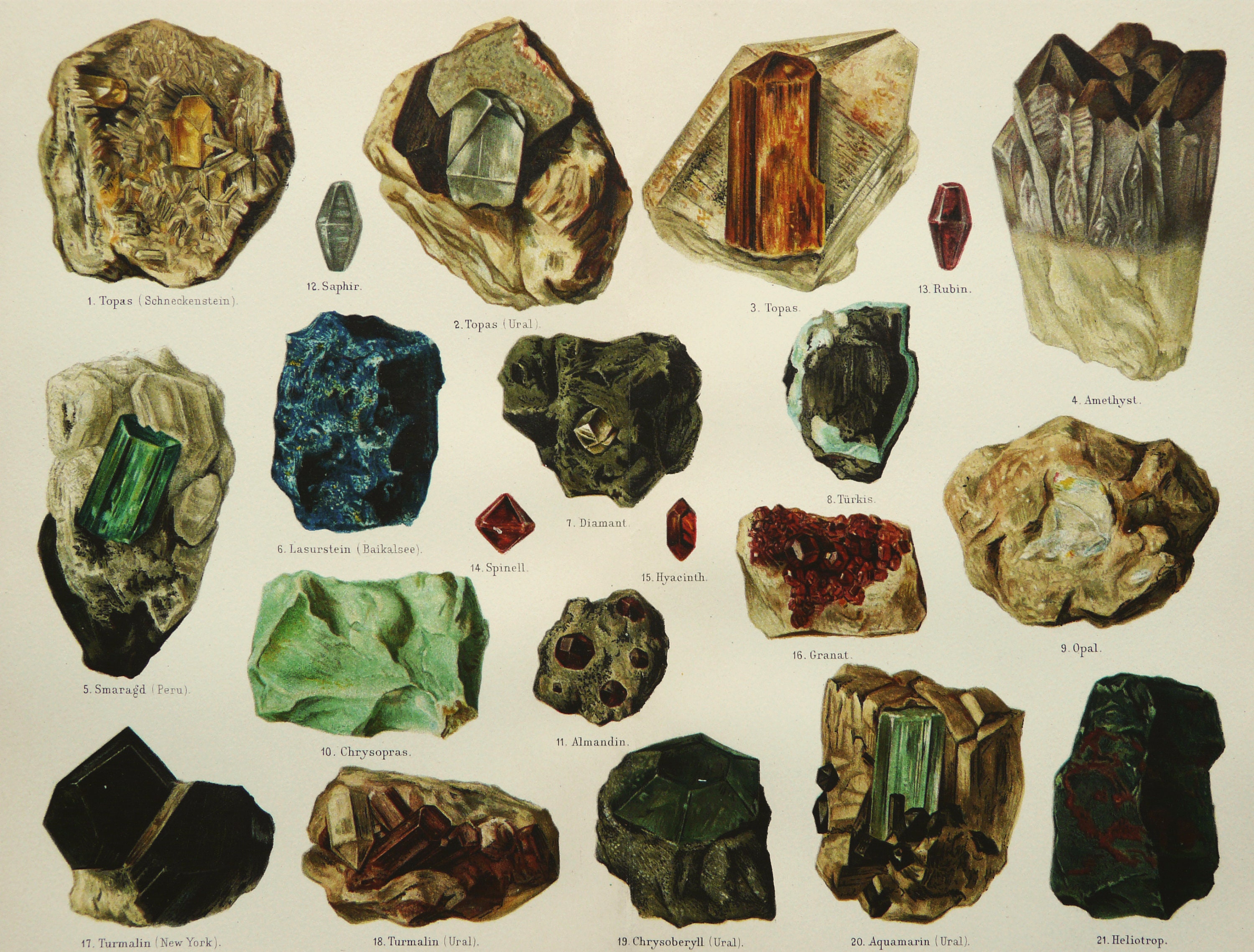 1897 Lithographie céleste antique de MINÉRAUX. ROCHERS. GEMMES. Pierres précieu...