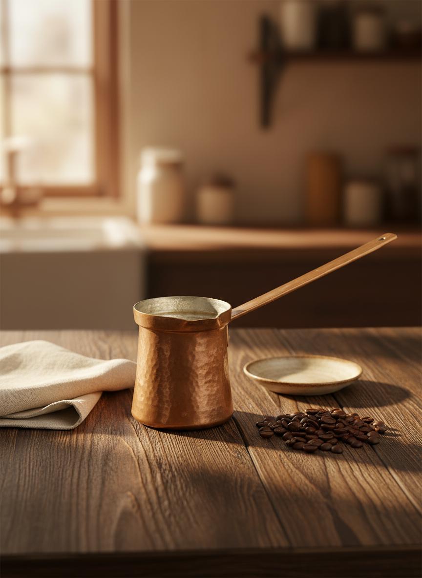 • Cafetière turque en cuivre, dessus de poêle, manche en...