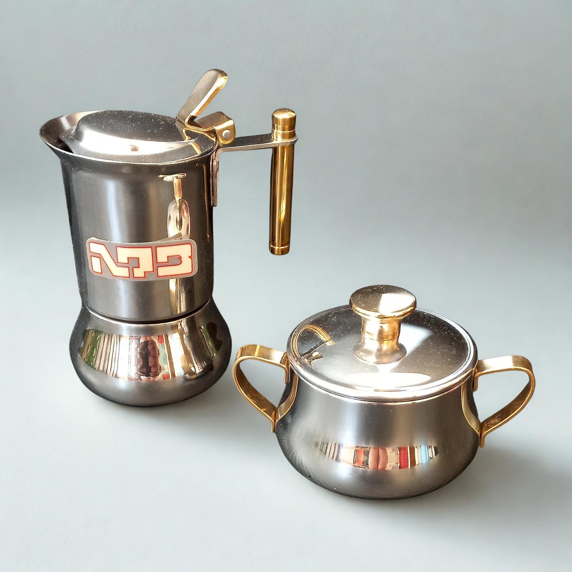 Ensemble cafetière neuf 2 tasses sucrier Acier 18/10 plaqué or Cafetière expres...
