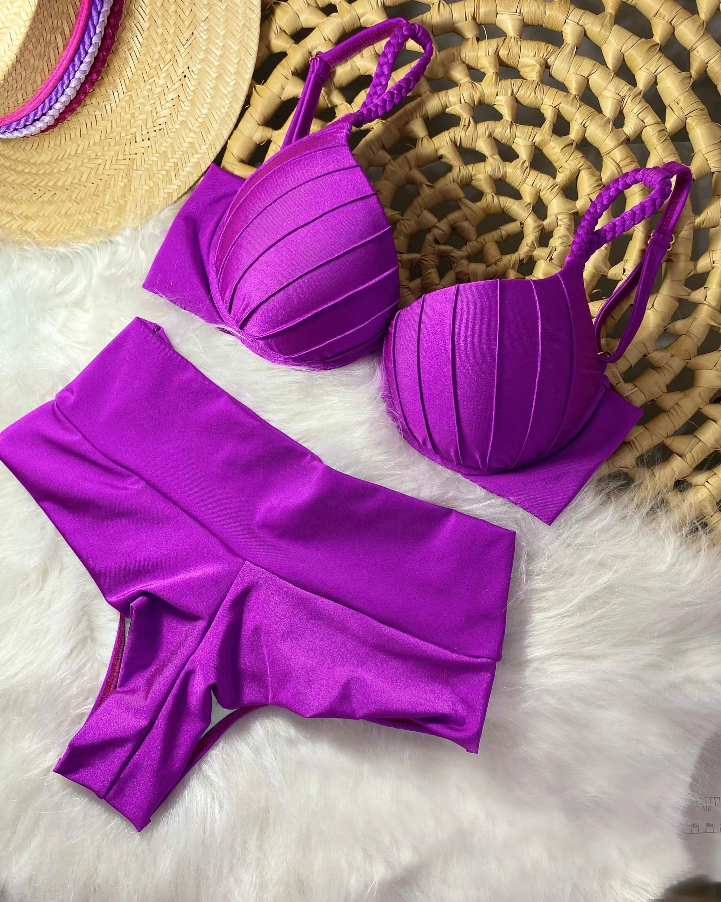 Pas cher Push Up Bikinis femmes maillots de bain solide rembourré femmes maillots de bain Vin...