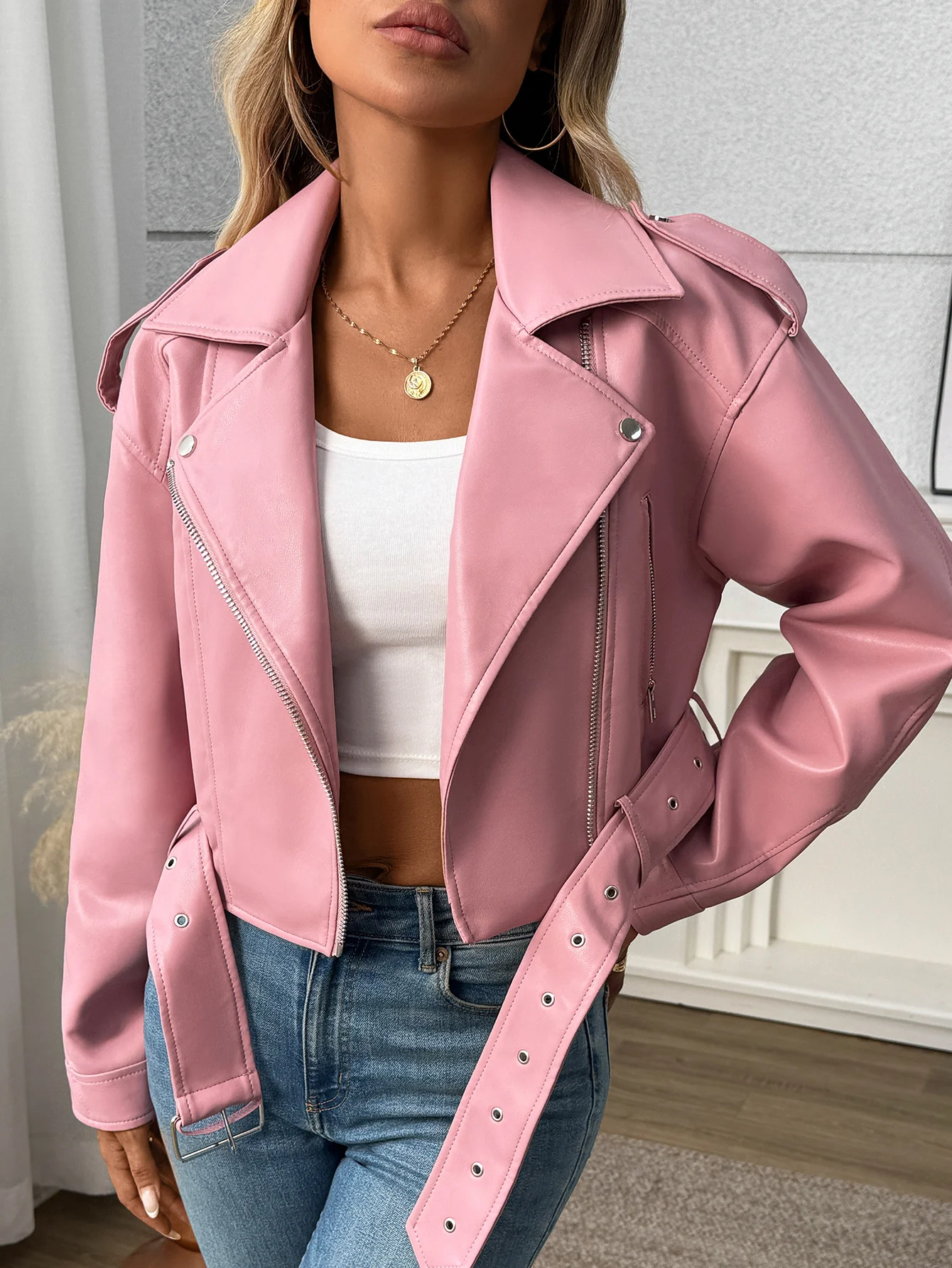 Veste de moto en cuir PU pour femmes, manteau court à lacets, col rabattu, manches longues, e...